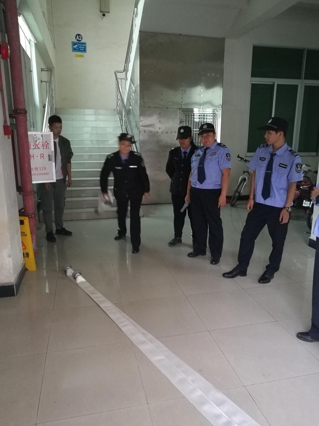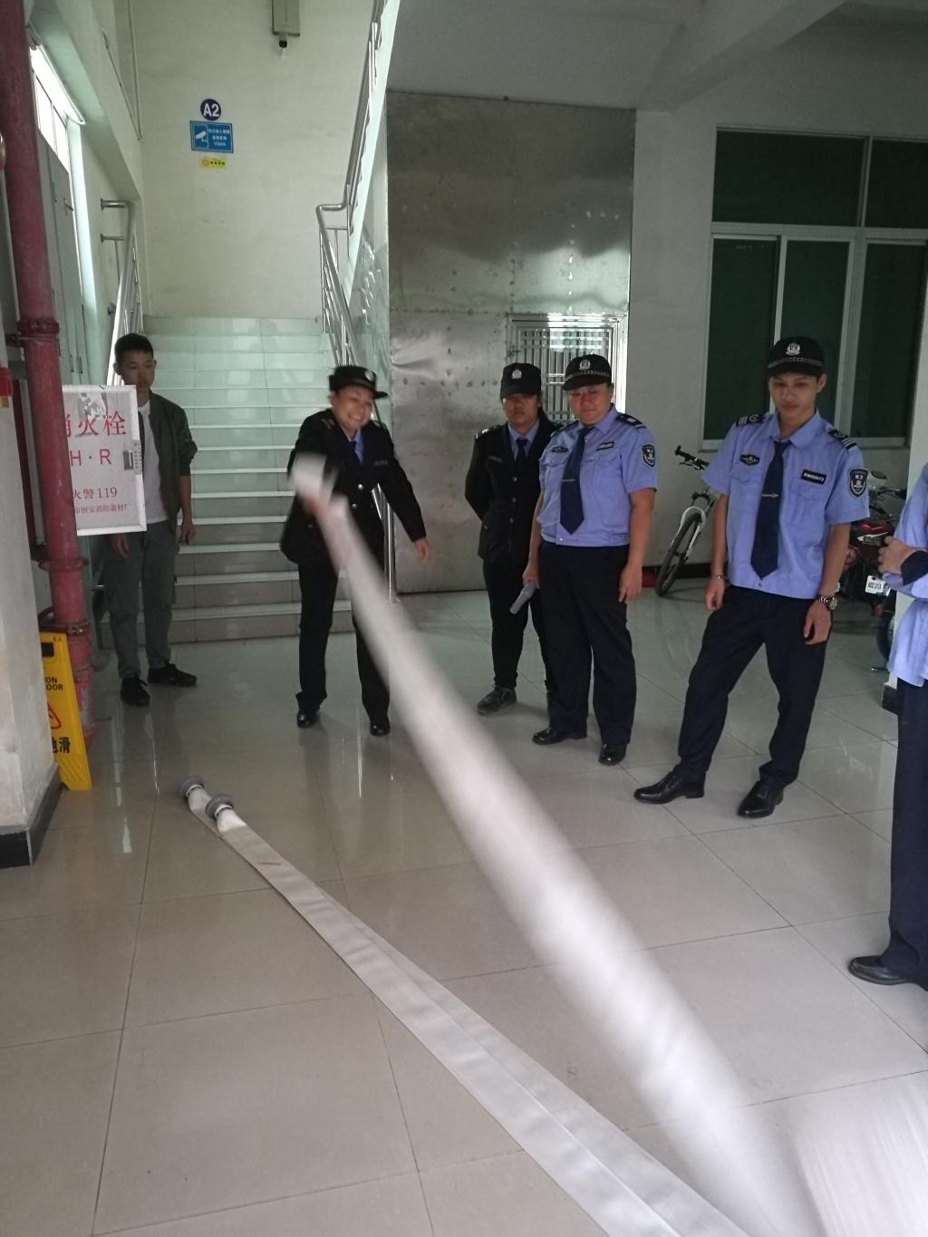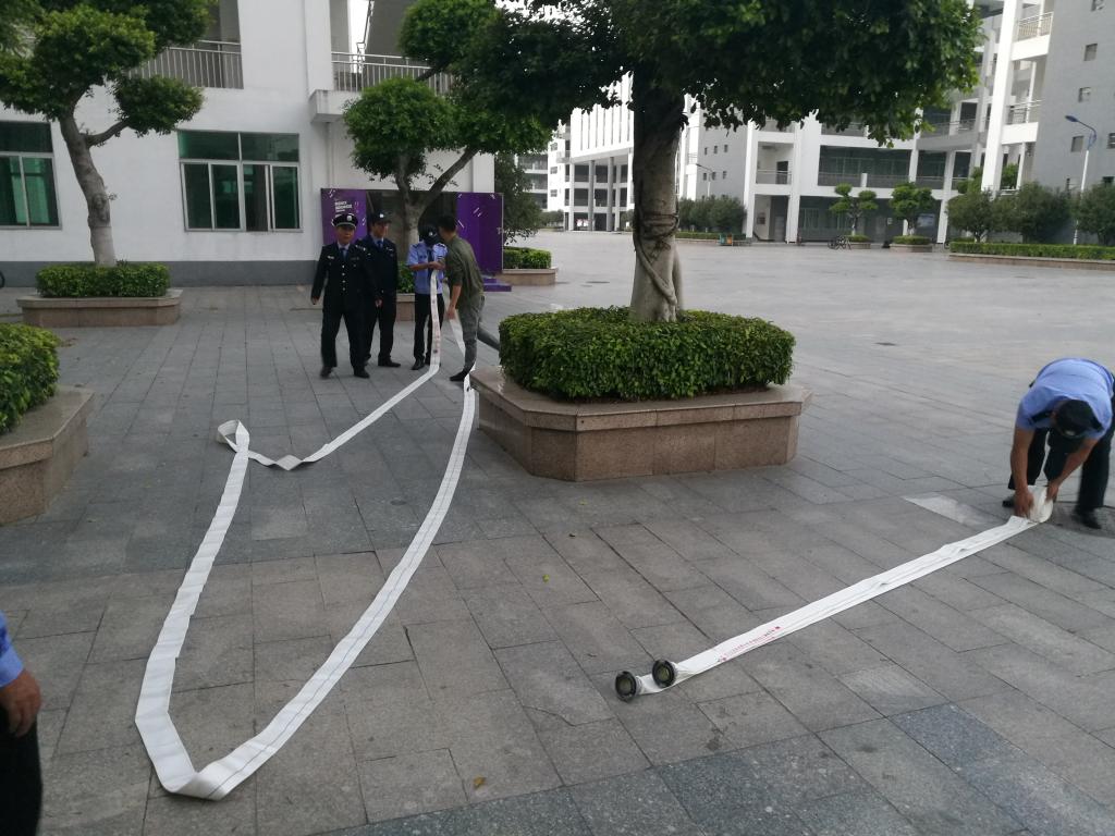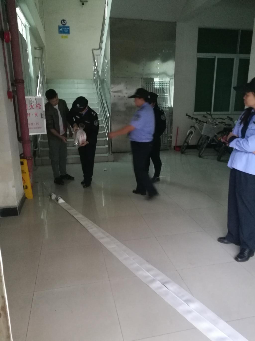 训练场地选定在第一教学大楼一楼走廊的消防栓处。消防专员何鑫给队员们讲解、示范了消防栓箱的打开、取出水龙带、向火场方向展开、出水龙口与水龙带的结合以及水龙带与消防水枪的结合等步骤和操作方法。接着让队员们先单人操作、后分组配合,反复进行了实际练习。