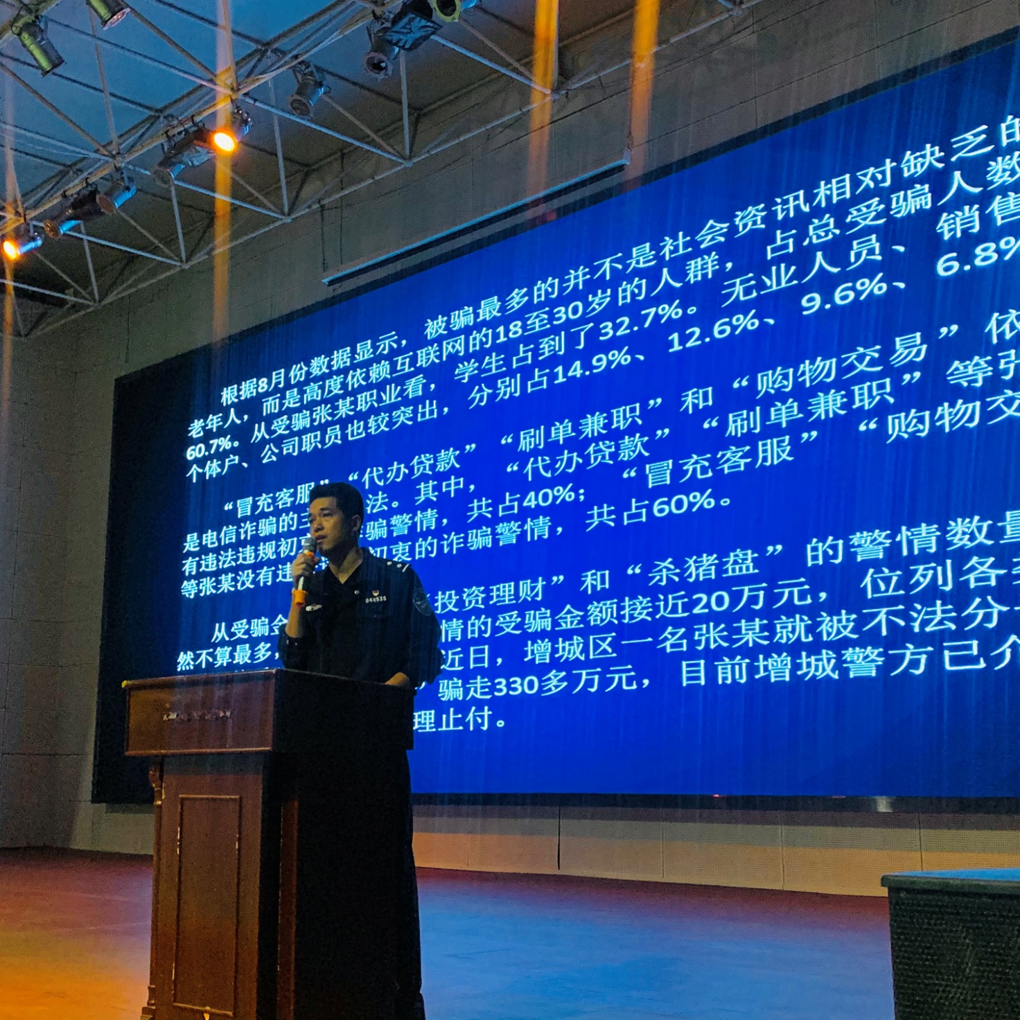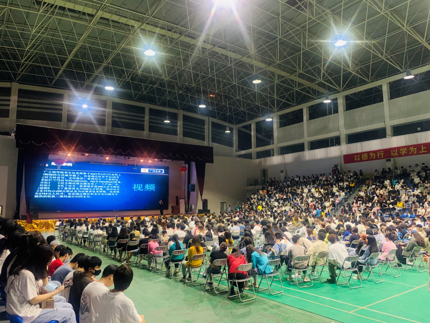 3月18日晚,为进一步提高全校师生的防骗意识,增强预防电信诈骗的技能,杜绝电信诈骗案件在ky开元发生,保卫处、学生处联合花都区狮岭镇合益派出所在ky开元花都校区体育馆开展预防电信诈骗专题讲座,保卫处、学生处主要负责人、花都校区全体辅导员、花都校区各年级、专业学生代表等共计1200人参加了本次讲座学习。讲座由广州公安二等功获得者、广州市优秀社区民警、合益派出所三级警长黄刚同志主讲,合成社区民警岑警官等进行分享交流。
