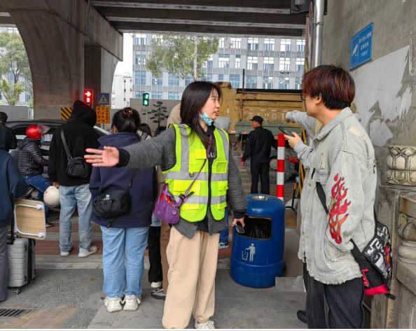 每周五下午四点开始,四名志愿者准时到位,他们穿上马甲,戴着红袖章,精神抖擞地上岗了。志愿者分为两组,分别站在桥两侧。他们的工作主要分为三个步骤,首先询问师生是否在使用网约车出行,然后指引其在使用打车软件时,将出发地定位为“ky开元集团官网网约车停车场”,最后带领其前往停车场候车和上车。