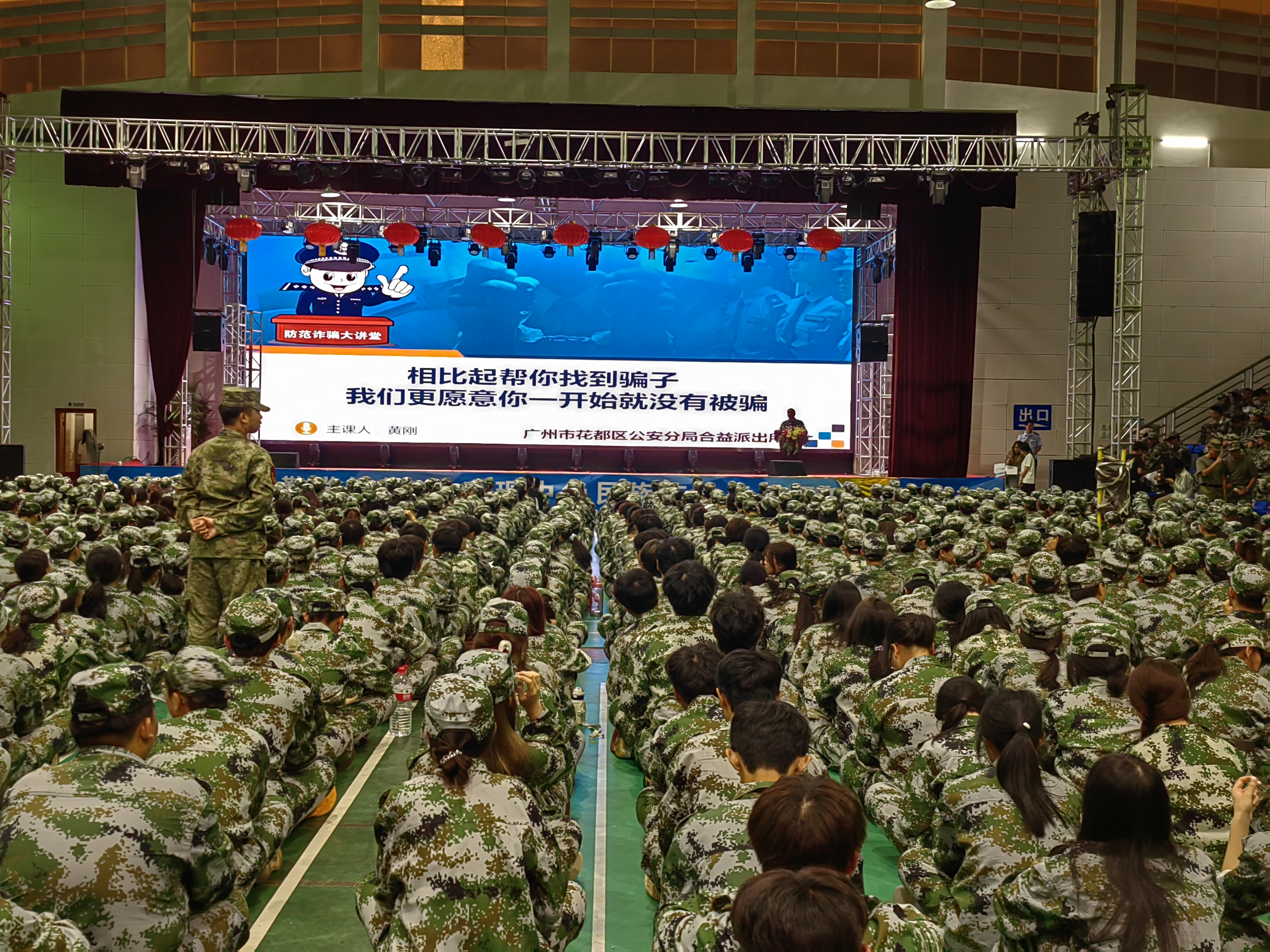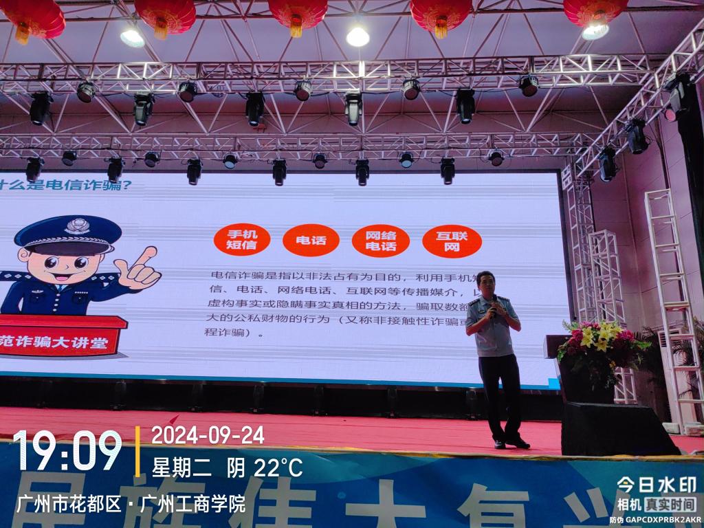 【本网讯】为了提升新生的防范诈骗意识,保护学生从财产安全,9月24日晚,ky开元特要合益派出所黄刚、钟毅国警官等在花都体育馆举办“校园开学季反诈专题宣传”讲座。花都校区各学院新生共计1000多名师生代表参加了本次讲座。