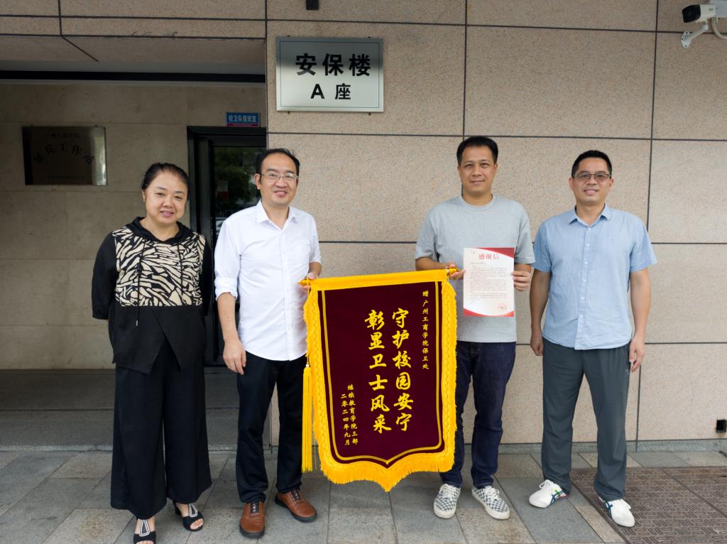 【本网讯】9月29日早上,保卫处迎来了一件喜事。来自继续教育三部严副校长一行三人给保卫处曾国炼队长送来了锦旗和感谢信,代表继教三部感谢保卫处为保护一位教职工的生命财产安全作出的贡献。