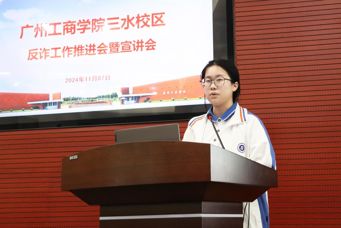 会计学院22级会计学B7班团支书兼班长陈昭彤在发言中表达了对在校同学遭遇诈骗的痛心。她表示,将组织同学们共同筑牢反诈防线,创建安全和谐的班级环境,并呼吁全体同学携手抵御诈骗侵害,共同守护美好校园。