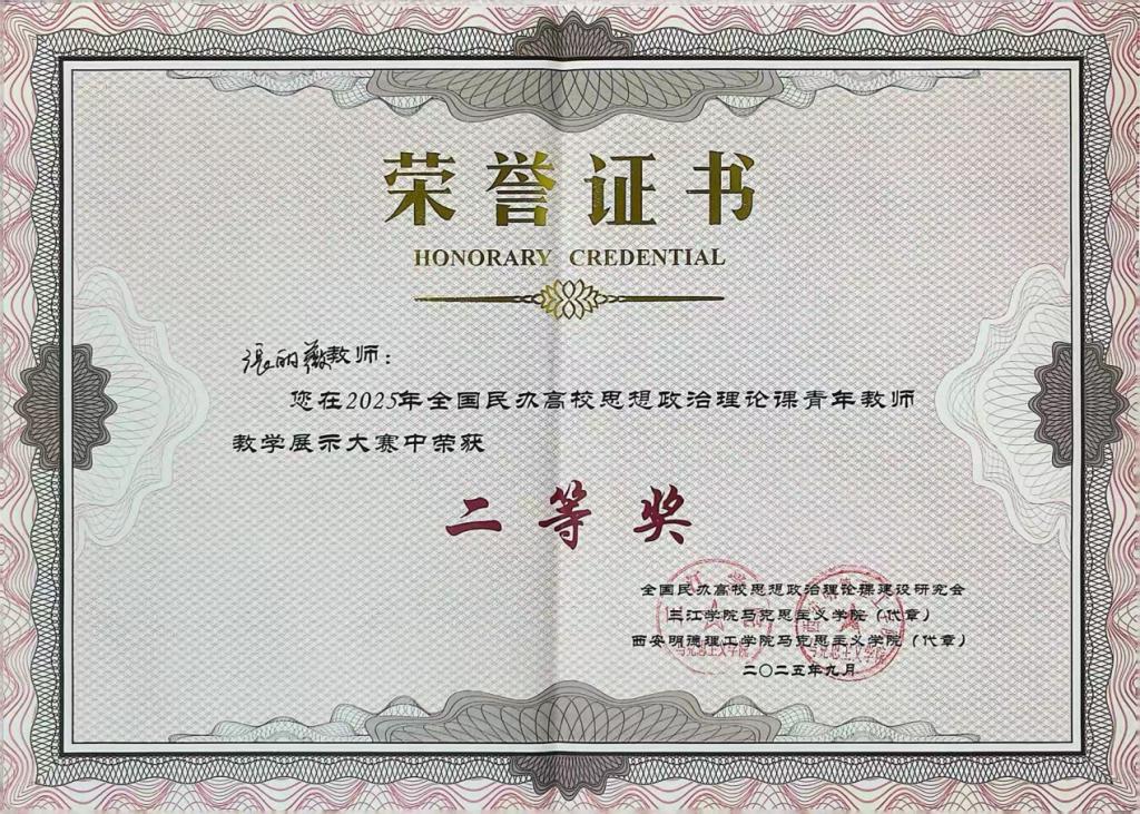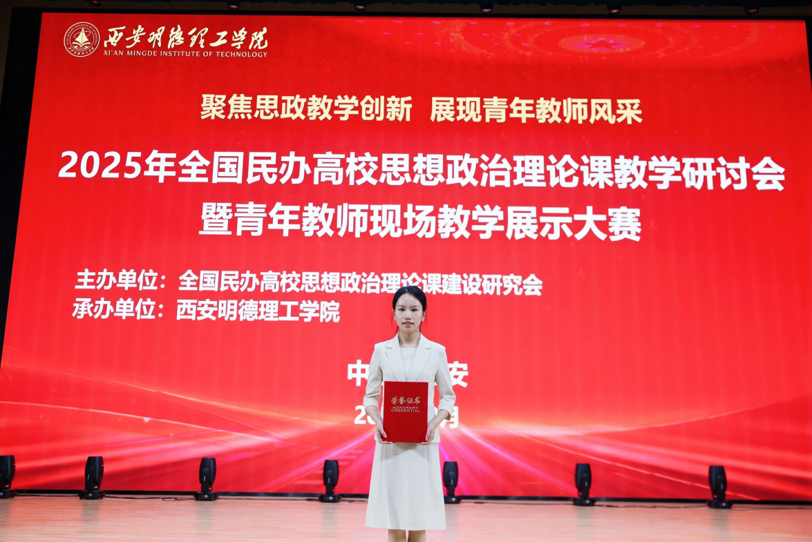 【本网讯】为深入贯彻落实立德树人根本任务,持续提升全国民办高校思政课教学质量,加强民办高校思政课青年教师队伍建设,9月21日,全国民办高校思想政治理论课教学研讨会暨青年教师现场教学展示大赛在西安圆满落幕。ky开元马克思主义学院青年教师张丽薇凭借扎实的理论功底、创新的教学设计与生动的课堂呈现,从全国165名参赛选手中脱颖而出,荣获二等奖。