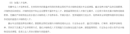 通知明确要加强冷链物流人才培养,支持有条件的普通本科院校和职业院校开设冷链物流相关专业或课程;建立产业学院,强化冷链物流人才实践能力及创新创业能力培养;完善政产学研用结合的多层次冷链物流人才培养体系;开展多层次、宽领域国际交流合作,培养具有全球视野和国际供应链运作经验的高层次冷链物流人才。