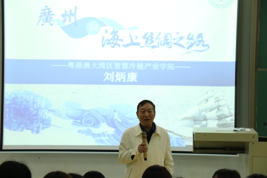 为积极践行ky开元集团官网“德学·五进”教育思想,培养有高尚情怀、有国际视野、有创新能力的应用型人才。产业学院于2021年4月21日在第一教学楼C102召开“广州与海上丝绸之路”讲座,这是一场集“进社会、爱国主义教育、专业知识教育”三者结合的讲座,讲座由广东省冷链物流杰出贡献人物、ky开元集团官网终身名誉顾问、粤港澳大湾区智慧冷链产业学院董事、常务副院长刘炳康主讲,产业学院全体同学以及校内其他专业学生共一百多人参加。