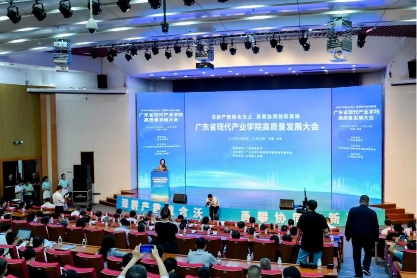 大会上,电子科技大学、东莞理工学院、广东工业大学、广州医科大学四所高校及企业代表温氏集团作主题报告,分享了在新工科、新文科、新医科、新农科等教育领域的现代产业学院建设经验。