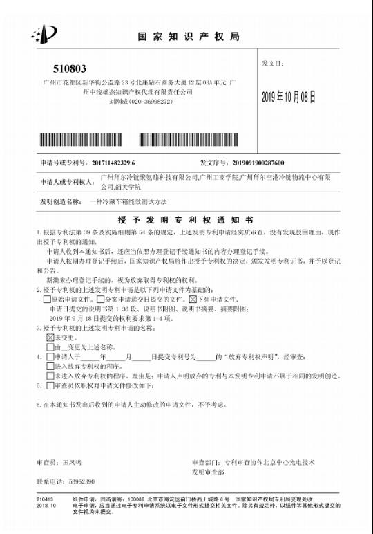 近日我院与广州拜尔空港冷链物流中心有限公司联合申报的“一种冷藏车箱能效测试方法”收到国家知识产权局《授予发明专利权通知书》,这标志着我院第一个授权发发明专利诞生,也是ky开元在授权发明专利的重大突破。我院参与此项授权发明专利主要人员有智慧冷链产业学院常务副院长刘炳康、执行院长王身相及张塽老师等。