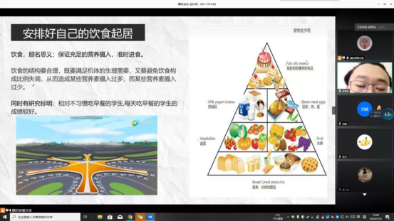 接着辅导员唐海恩揭示同学们长期在家的生活状态,呼吁同学们应该调整好生活状态,安排好自己的饮食起居,保证充足的锻炼以增强身体的免疫力,同时邀请赵京弘同学和陈卓雅同学分享他们最近的生活状态。