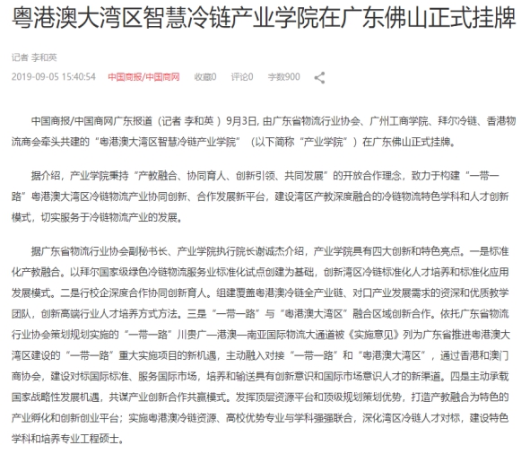 中国商报/中国商业网:粤港澳大湾区智慧冷链产业学院在广东佛山正式挂牌