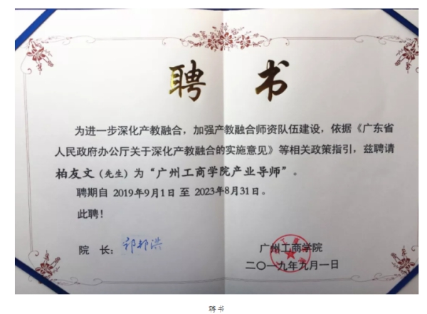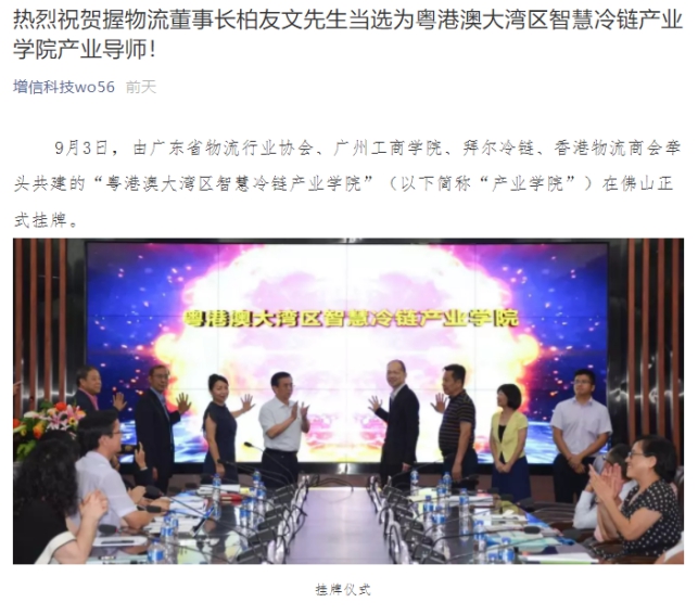 增信科技:握物流董事长柏友文先生当选为粤港澳大湾区智慧冷链产业学院产业导师