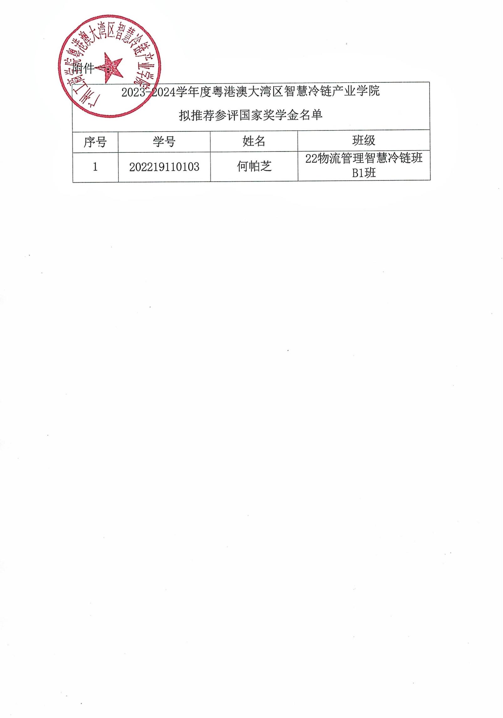 2023-2024学年度粤港澳大湾区智慧冷链产业学院拟推荐参评国家奖学金公开评选名单公示