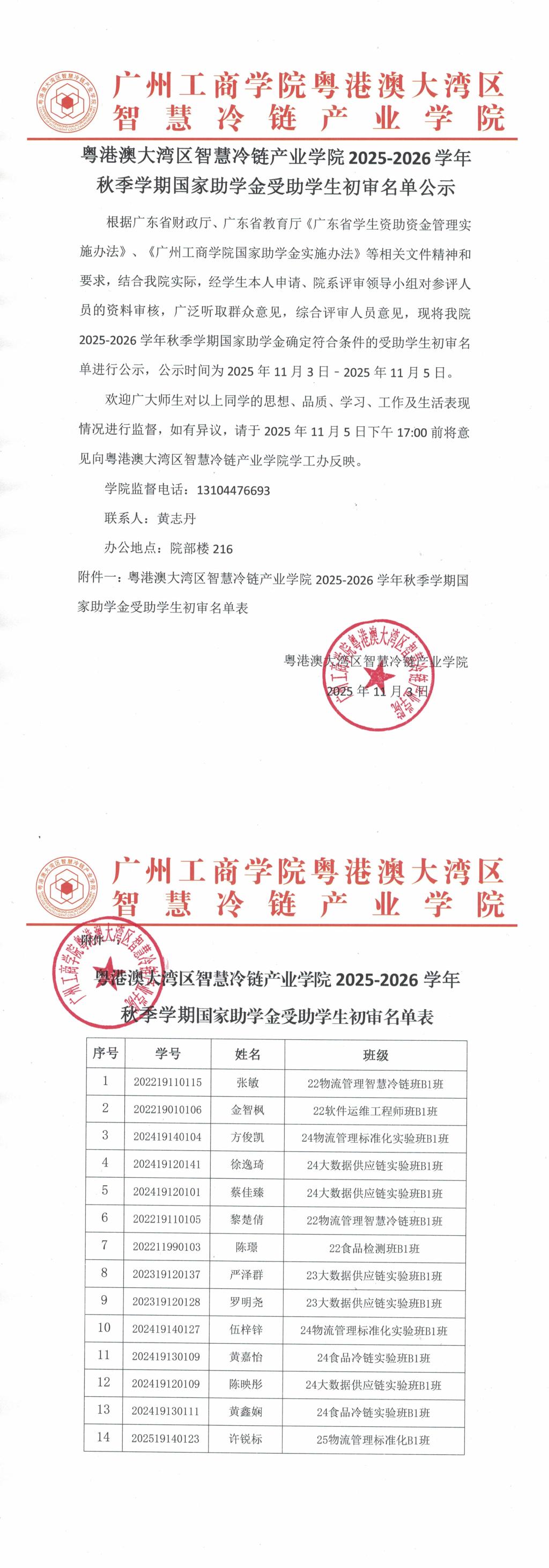 粤港澳大湾区智慧冷链产业学院2025-2026学年秋季学期国家助学金受助学生初审名单公示