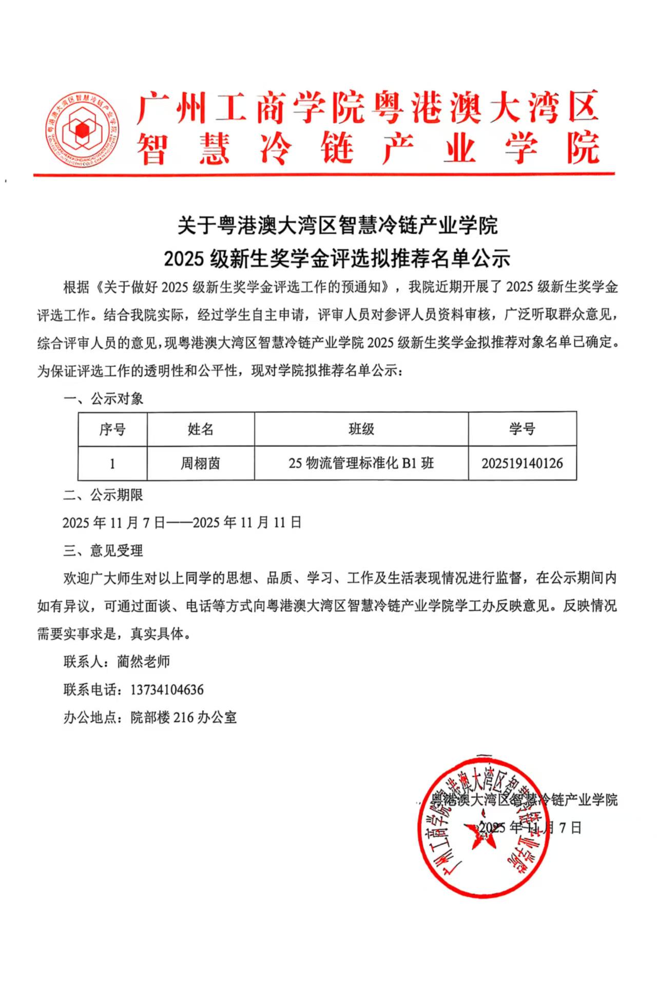 关于粤港澳大湾区智慧冷链产业学院2025级新生奖学金评选拟推荐名单公示