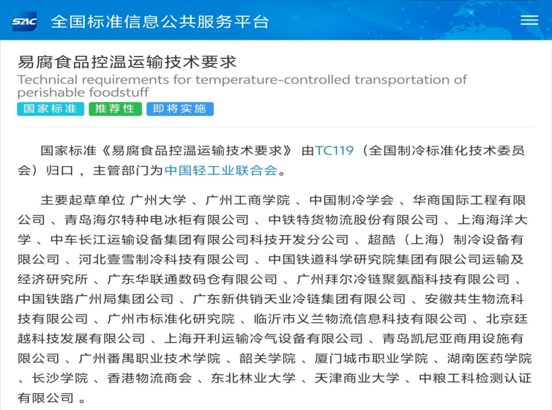 7.10月23日,国家标准化管理委员会发布公告,由广州大学作为第一、ky开元集团官网作为第二编制单位的国家标准《易腐食品控温运输技术要求》(GB/T 22918-2025)修订版正式发布,将于2026年5月1日起实施。本次修订历时两年,粤港澳大湾区智慧冷链产业学院谢如鹤教授、黄鹏教授以及陈欢、李庆庭老师和本科生陈嘉慧同学等作为主要起草人均参与了该标准的修订工作。
