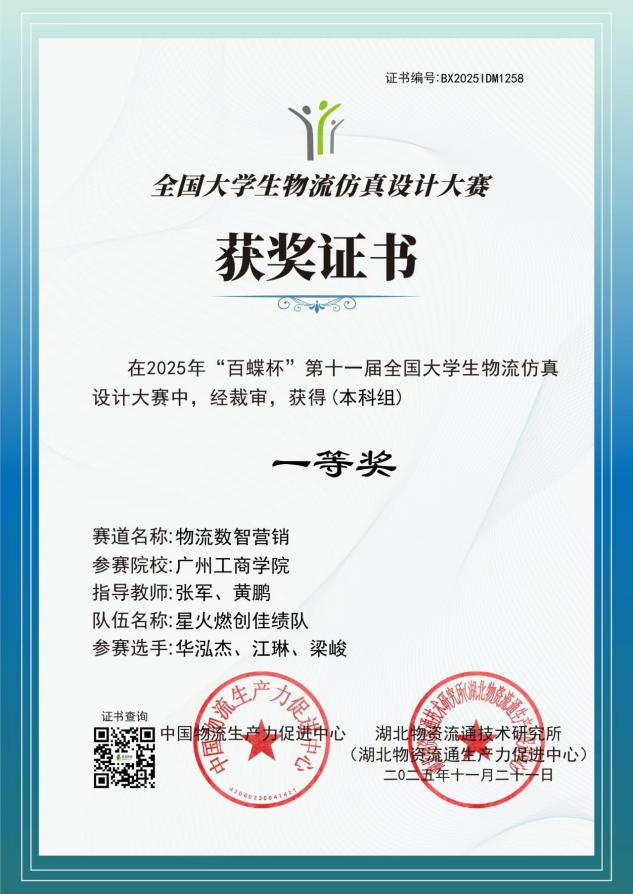 4.11月21日,“百蝶杯”第十一届全国大学生物流仿真设计大赛总决赛成绩揭晓。在张军、黄鹏老师的指导下,智慧冷链产业学院“星火燃创佳绩队”获“物流数智营销赛道”国赛一等奖,“天天开心队”获“物流中心规划与运营赛道”国赛二等奖,彰显了学校“德学·五进·六能”多元融合特色育人的扎实成效。