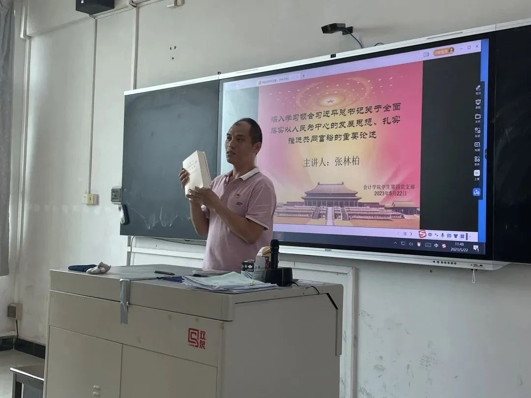 为深入学习领会习近平总书记关于全面落实以人民为中心的发展思想、扎实推进共同富裕的重要论述,进一步提升入党积极分子对共同富裕的认识,会计学院学生第四党支部于5月22日在第一教学楼A301组织开展理论学习,参加人员有学生第四党支部书记张林柏同志、组织委员杨佩同志、宣传委员陈敏莉同志及第一期入党积极分子。