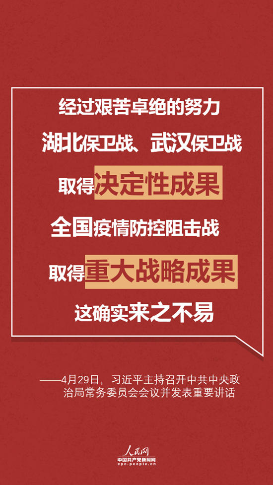 习近平在会议上指出,在党中央坚强领导和各方面大力支持下,在湖北人民特别是武汉人民积极参与配合下,经过艰苦卓绝的努力,湖北保卫战、武汉保卫战取得决定性成果,全国疫情防控阻击战取得重大战略成果。这确实来之不易。
