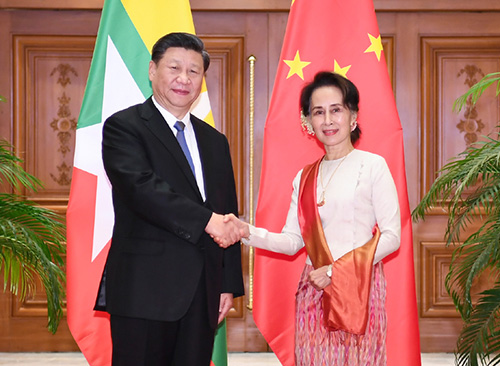 当地时间1月18日上午,国家主席习近平在内比都同缅甸国务资政昂山素季举行正式会谈。