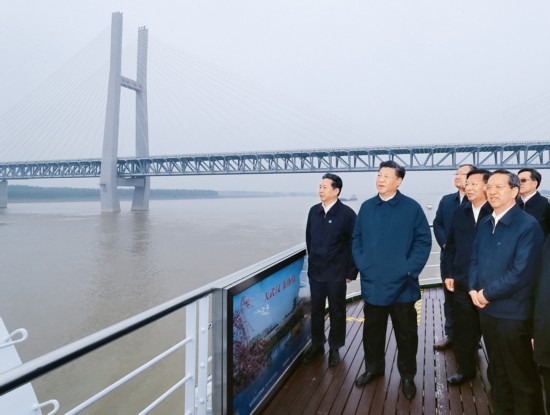 2018年4月26日下午,中共中央总书记、国家主席、中央军委主席习近平在武汉主持召开深入推动长江经济带发展座谈会并发表重要讲话。这是座谈会前,习近平于25日上午乘船沿江察看两岸生态环境和发展建设情况。 新华社记者 谢环驰/摄