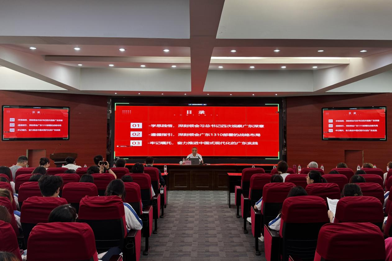 其次,张振超带领师生们深入学习了习近平总书记视察广东时作出的战略指引和省委“1310”具体部署。全省在锚定“走在前列”总目标、激活“三大动力”、奋力实现“十大新突破”过程中,推进了高质量发展,奋力书写了中国式现代化的广东篇章。他特别强调了创新在教育强省、科技创新强省、人才强省建设中的重要作用,并指出没有创新就没有发展动力。同时鼓励同学们立足地方经济发展、结合自身实际,参与社会服务,积极落实“1310”具体部署。