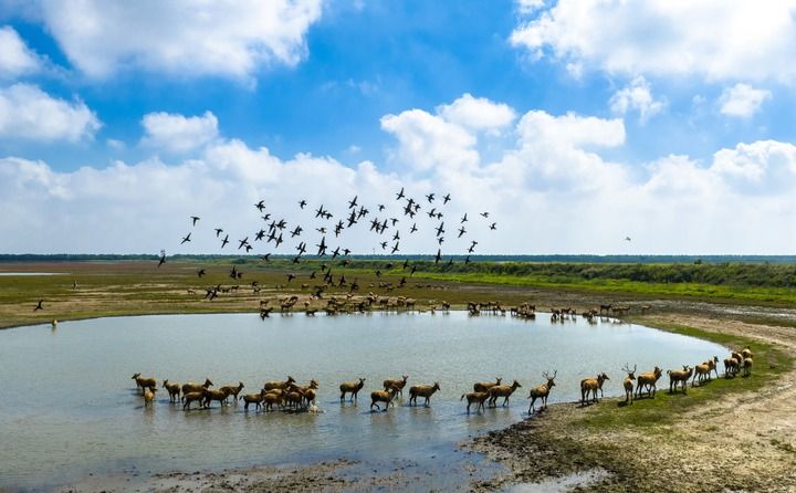 2025年10月11日,在江苏东台条子泥湿地,候鸟飞翔,成群野生麋鹿悠闲散步,一派人与自然和谐共生的生态美景(无人机照片)。