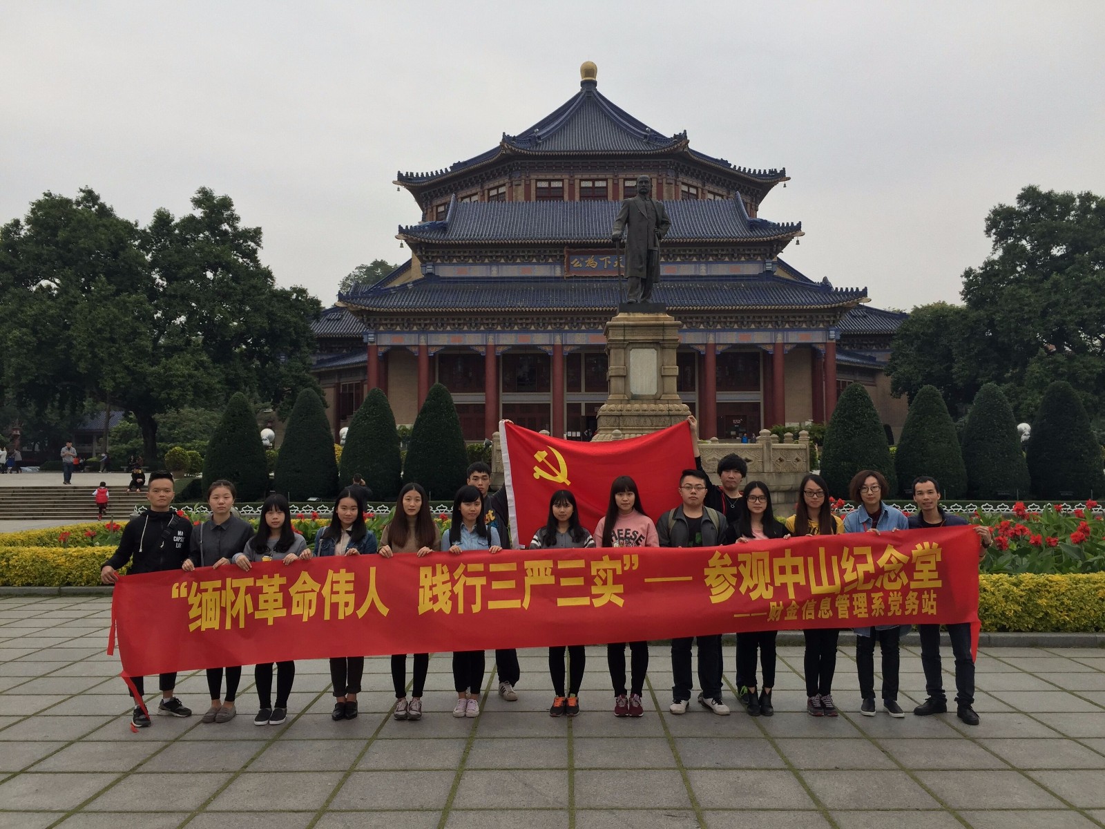 【本网讯】为了让学生深刻学习和努力践行“三严三实”,更好地了解中华文化,进一步增强自身的政治意识、责任意识和纪律意识,2015年12月11日下午, 由党总支副书记司晓婧老师、党总支宣传委员蔡宗坚老师带领财金信息管理系党务站14级全体成员到广州市中山纪念堂开展“中山纪念堂红色之旅”。