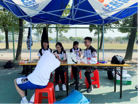 从7:50到19:00,参加志愿服务的同志们在体测现场搭建志愿服务岗,对体测场地附近落叶和杂物进行清理,维护现场秩序,为学生提供矿泉水,协助医护人员为体测的学生保驾护航。同志们都保持着高素养、高服务精神,分工明确,积极负责地完成各自所在区域的职责。