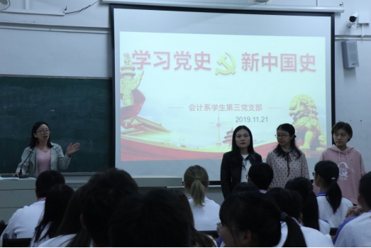【本网讯】 11月21日,会计系学生第三党支部在三水校区举办“学习党史、新中国史”的主题学习活动。党支部书记熊玉琴同志和李青芫同志分别讲授专题党课。