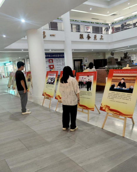 为迎接党的二十大召开,10月8日-10月31日,机关四党支部与图书馆在两校区进行“青春献礼二十大 强国有我新征程”展览。本次展板内容分为前言、十八大以来习近平关于教育的重要论述、习近平致首届全民阅读大会举办的贺信(全文)、《习近平谈治国理政》第四卷中关于教育或人才的论述、我们身边的杰出青年楷模五部分。