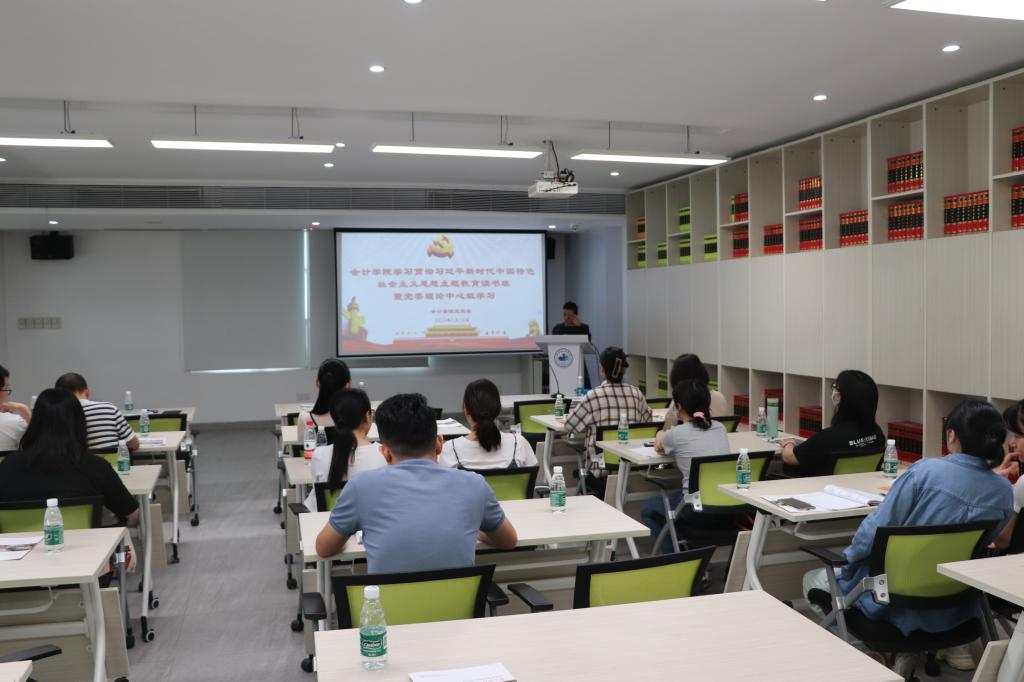 【本网讯】5月18日晚,会计学院党委举办学习贯彻习近平新时代中国特色社会主义思想主题教育读书班暨党委理论学习中心组学习专题会,深入学习领会习近平总书记关于全面从严治党、推进自我革命的重要论述。会计学院党委副书记、副院长全桂艳作领学报告,学生第四党支部书记张林柏作主题发言。党委委员、各党支部负责人、支部委员参加。读书班由学院党委宣传委员刘帅飞主持。