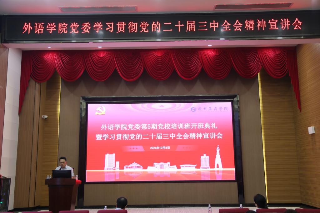 2024年10月8日14:30,外语学院党委第5期党校培训开班典礼暨学习贯彻党的二十届三中全会精神宣讲会在图书馆416举行,会议主题为学习党的二十届三中全会精神之深化教育综合改革,会议由外语学院党委宣传委员高亮副院长主持,外语学院师生党员、第5期党校培训班的发展对象和积极分子参加。