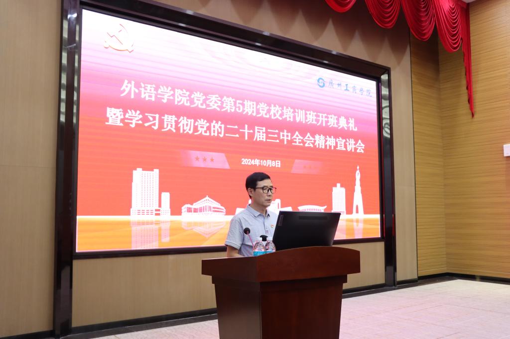 【本网讯】为深入学习贯彻党的二十届三中全会精神,10月8日下午,外语学院党委在花都校区举行宣讲报告会,由外语学院党委书记、院长刘沛富教授担任主讲。外语学院党委宣传委员、副院长高亮主持,外语学院全体师生党员以及学院第5期党校培训班学员近120人到会学习。