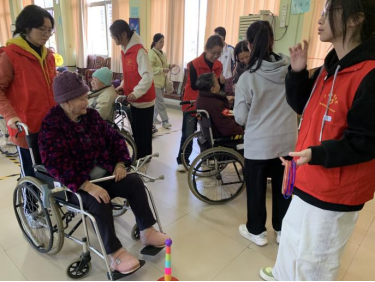 互动游戏环节中,志愿者与老人们一起玩起了套圈圈和投壶游戏。老人们瞄准目标,抛出手中的圈环或投出手中的箭,每一次成功都会引发阵阵欢呼。老人们的参与热情高涨,全神贯注地投入到游戏中,现场欢声笑语不断,充分展现了老少同乐的温馨画面。