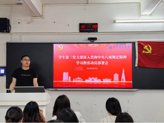 为深入学习贯彻党的二十大精神,认真落实全面从严治党要求,增强师生党员纪律意识,弘扬优良作风。外语学院学生第三党支部于2025年3月28日在外语楼302教室召开学习贯彻中央八项规定精神专题学习动员部署会。支部党员共25人参会,党支部书记毕玉祥作动员讲话。