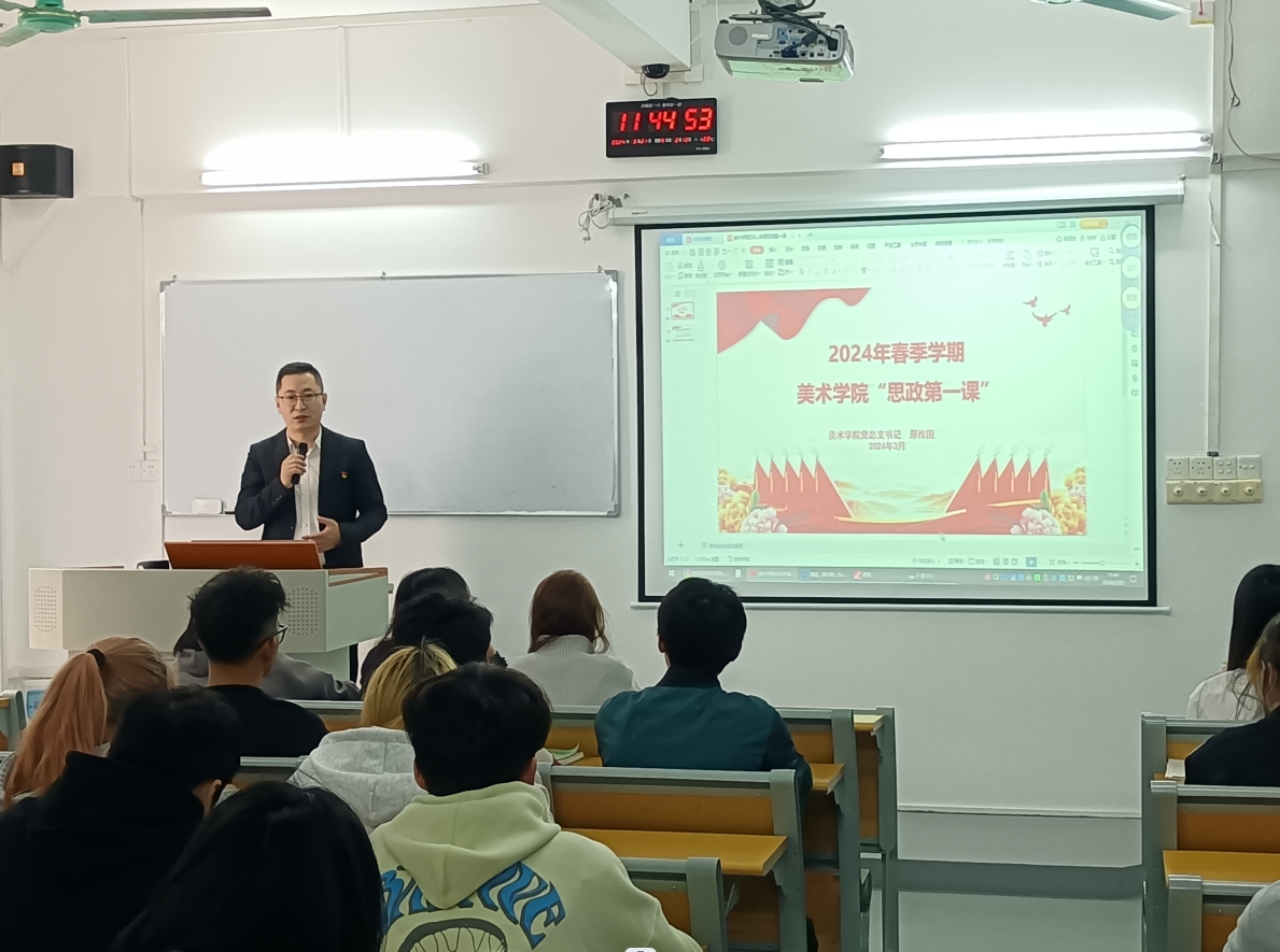 根据《ky开元集团官网2024年春季学期高校党委书记、校长和院党组织书记、院长上第一堂思政课活动的通知》要求,2024年3月21日,美术学院党总支邢传国书记在花都校区第五综合楼201室讲授2024年春季学期第一堂思政课,美术学院2023级学生代表参加。