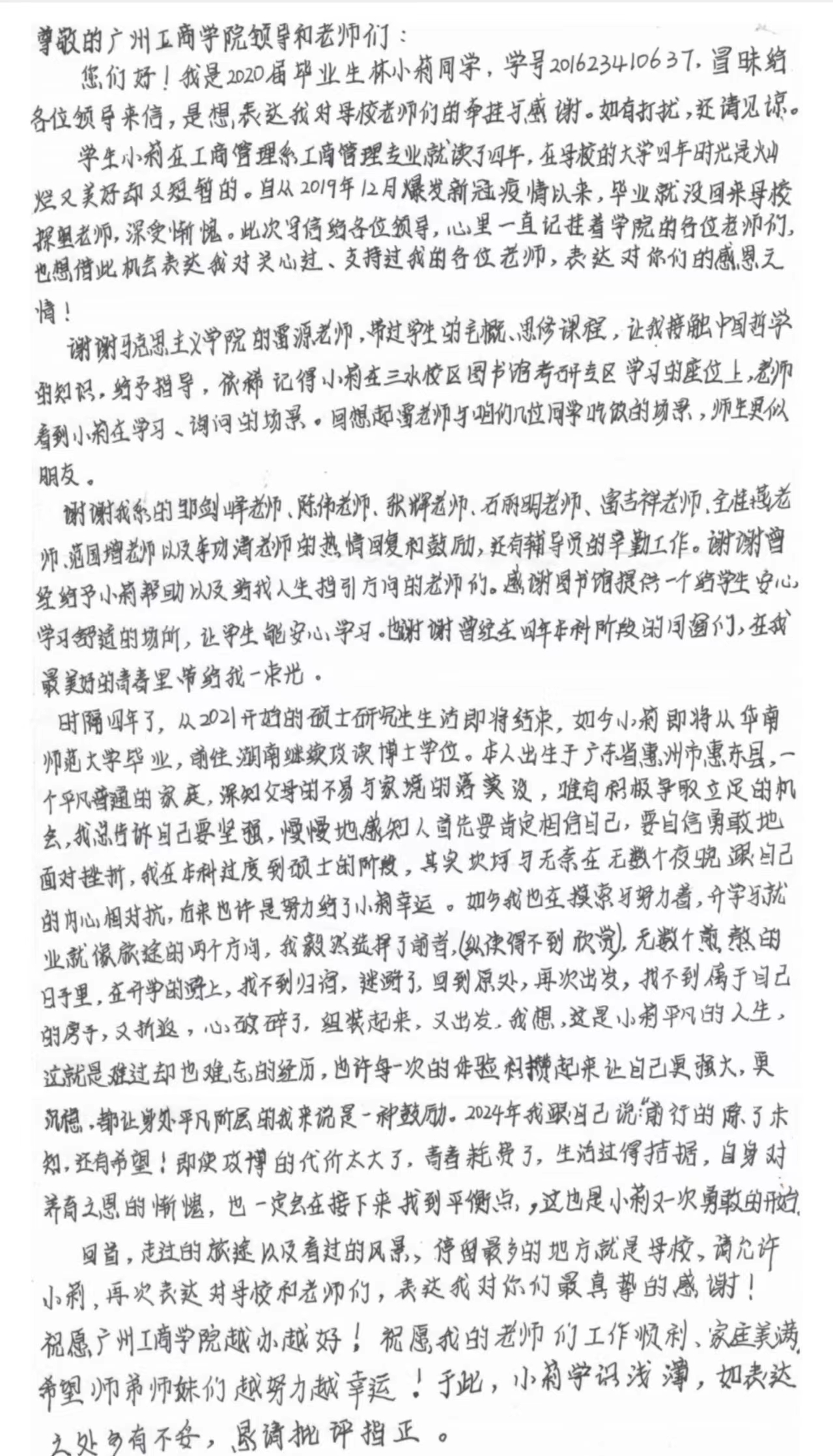 近日,学校董事长信箱收到了2020届工商管理专业林小莉校友寄给学校的一封饱含深情的感谢信,字里行间透露出她对学校的深深眷恋与不舍,以及对学校教师雷源、邹剑峰、陈伟、张辉、石丽明、富吉祥、全桂燕、范国增、李功清等人的感恩之情。从ky开元集团官网本科,到华南师范大学硕士研究生,再到中南大学博士研究生,林小莉校友以她坚定的步伐和不懈的努力,在学业道路上大放异彩。今天的学业成就是对她个人努力的最好回报,也是对学校培养的最好证明。她用自己的实际行动诠释了“正德厚生 励志修能”的校训精神,为广大学子树立了榜样。在漫长的成长道路上,学校希望校友们和在校学生们能深怀感恩之心,铭记肩头之责任,始终保持乐于创造和奉献的精神。同时,也衷心欢迎校友们来信分享你们的经历和故事。你们的成功经历、职场心得和人生感悟,对于学校的师生来说都是非常宝贵的学习资源。我们深信,通过校友们的来信分享,将能够激励更多的学子们奋发向前,追求卓越。