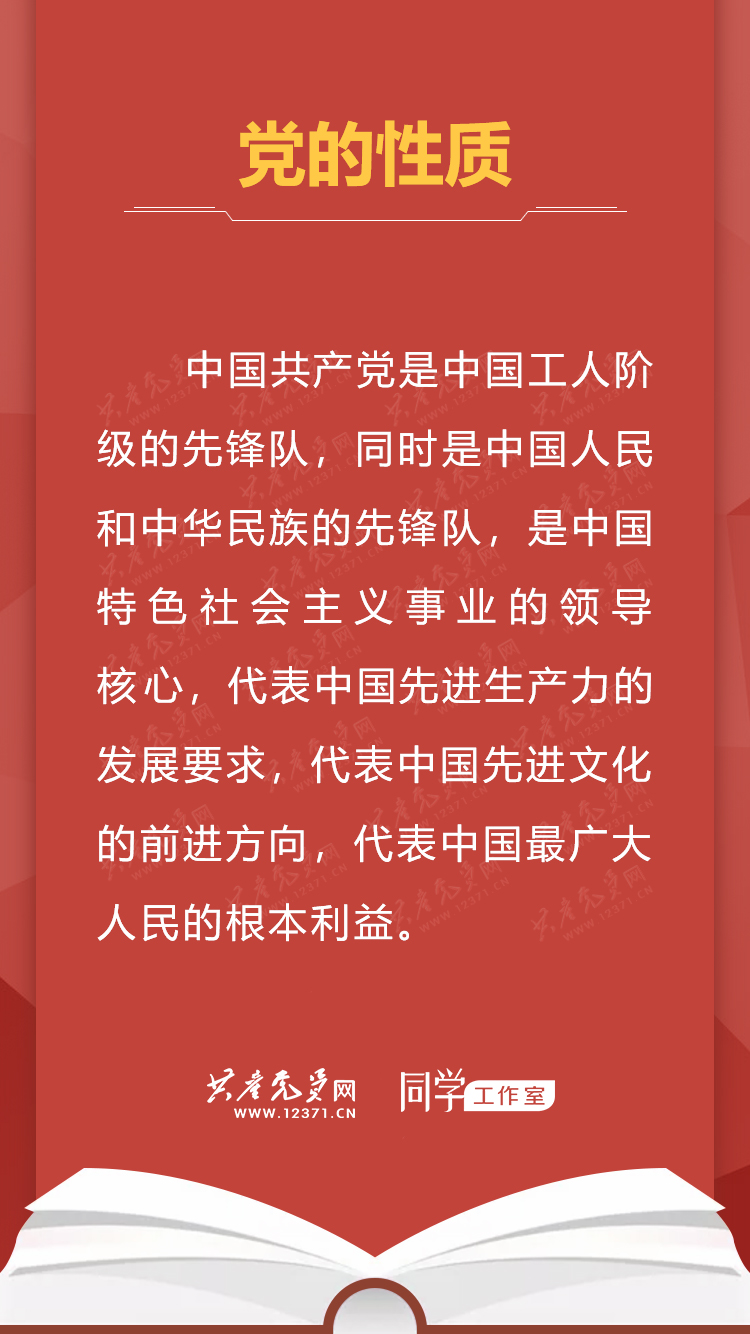 中国共产党是中国工人阶级的先锋队,同时是中国人民和中华民族的先锋队,是中国特色社会主义事业的领导核心,代表中国先进生产力的发展要求,代表中国先进文化的前进方向,代表中国最广大人民的根本利益。
