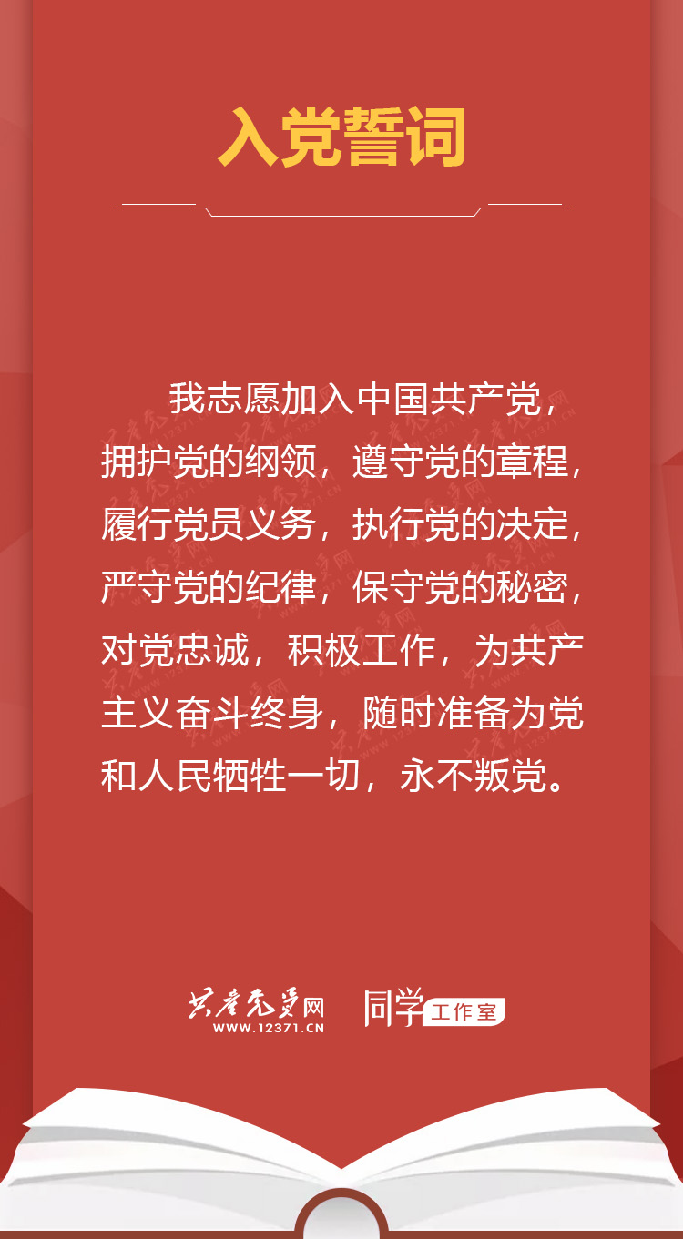 我志愿加入中国共产党,拥护党的纲领,遵守党的章程,履行党员义务,执行党的决定,严守党的纪律,保守党的秘密,对党忠诚,积极工作,为共产主义奋斗终身,随时准备为党和人民牺牲一切,永不叛党。