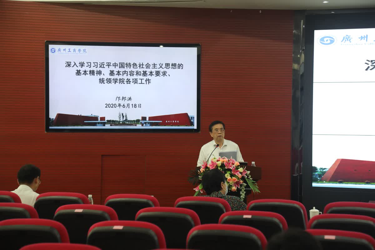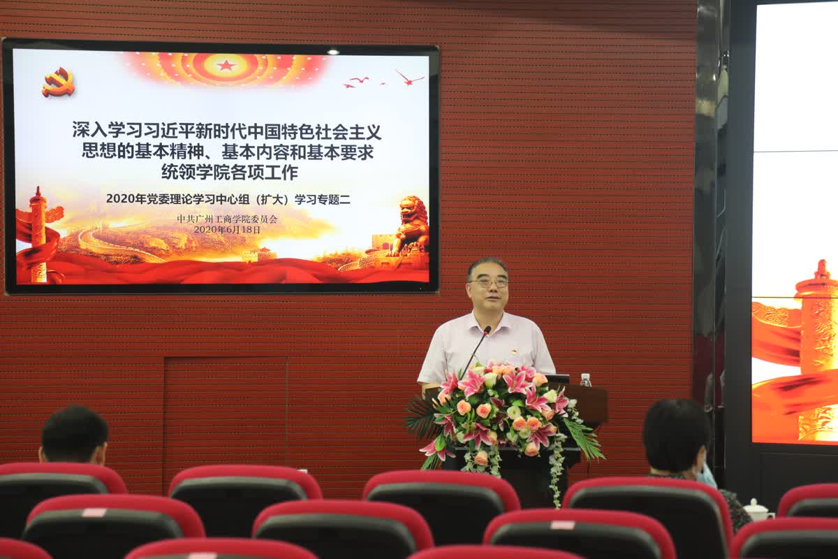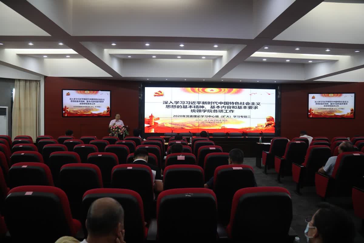 【本网讯】6月18日下午,学院党委理论学习中心组(扩大)学习会在三水校区行政楼322报告厅召开。学习会主题为“深入学习习近平新时代中国特色社会主义思想的基本精神、基本内容和基本要求,统领学院各项工作”。学院院长邝邦洪作领学发言,党委书记张振超主持,学院领导班子成员、两委委员、中层正职参加。