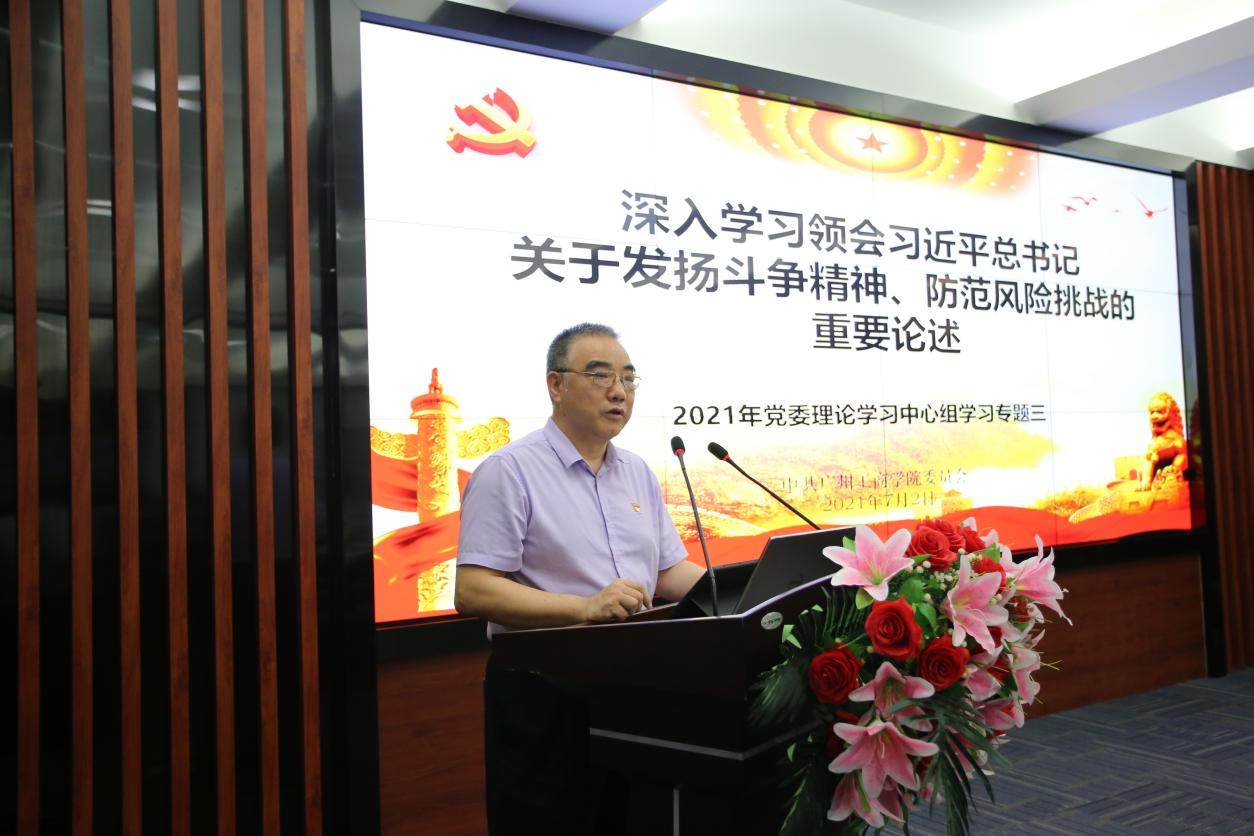 【本网讯】7月2日下午,学校党委书记张振超主持召开党委理论学习中心组学习会,深入学习领会习近平总书记关于发扬斗争精神、防范风险挑战的重要论述。党委委员、副校长易露霞作领学发言,商学院党总支书记张娜、工学院党总支书记罗俊、管理学院党总支副书记赵小锋作交流发言。学校领导班子成员、两委委员、二级党组织书记参加。