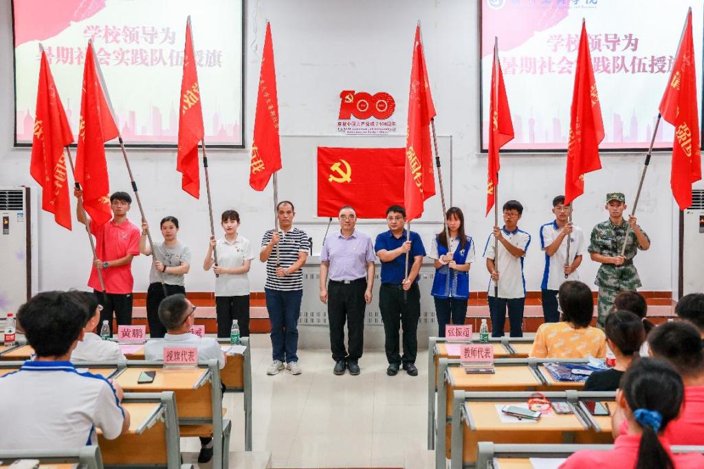 7月19日上午,在学校青萌公益、团委思源志愿服务队、美术学院初旭服务队等80余师生即将奔赴河源、惠州、云浮以及茂名等地开展暑期社会实践活动之际,学校校长邝邦洪教授、党委书记张振超同志为当天出发的队伍壮行。