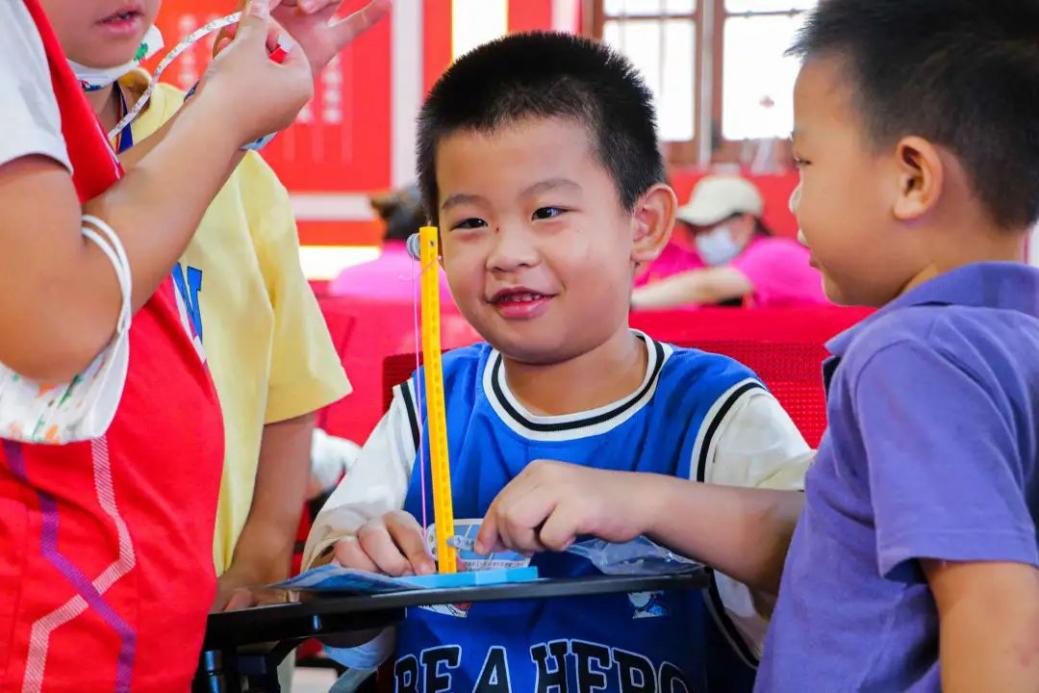 图为小朋友们在动手进行“国旗升降台”小实验