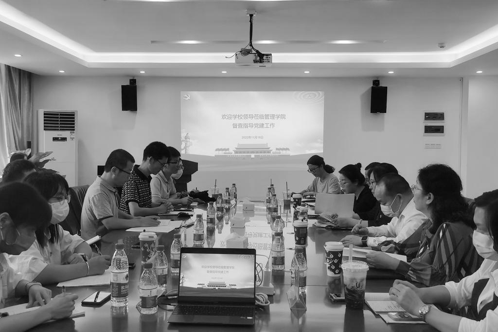 【本网讯】为贯彻党的二十大精神,坚定不移全面从严治党,夯实基层党组织党建工作基础,进一步推进学校基层党建工作规范化、制度化、科学化,11月18日下午,校党委副书记、副校长张辉教授带领学校党委办公室、组织部、宣传部等一行10人莅临管理学院开展基层党建督查工作,管理学院党委书记、院长乔鹏亮,副书记、副院长赵小锋,副院长邹剑峰及管理学院全体党务干部参加检查。