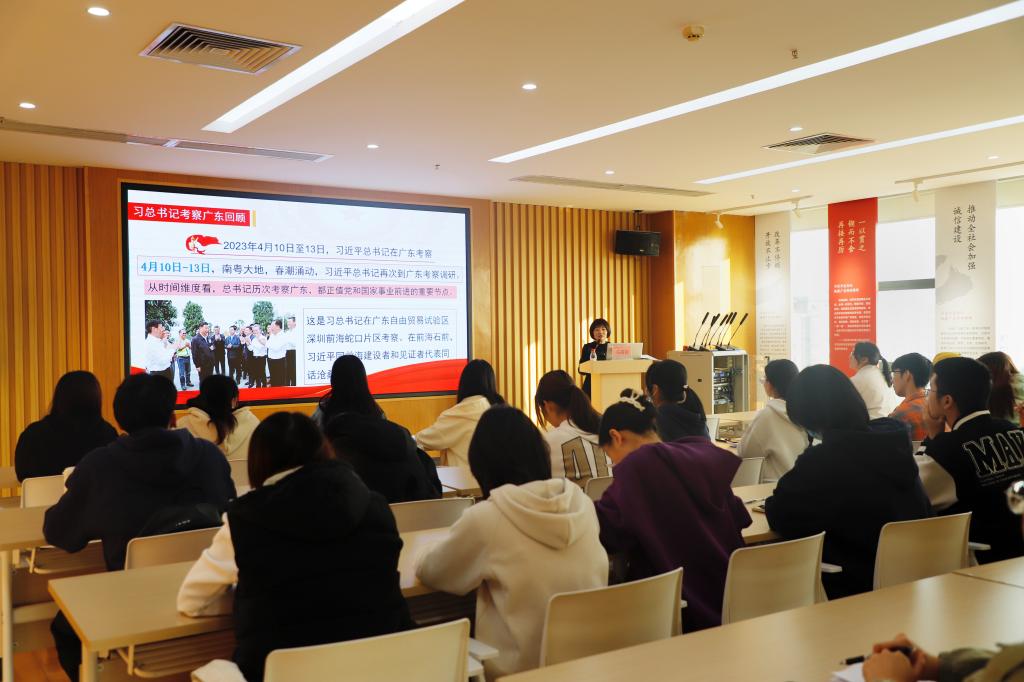 易露霞副校长带领学生回顾了习近平总书记自党的十八大以来四次考察广东的历程。她指出,从时间维度看,习近平总书记历次考察广东,都正值党和国家事业前进的重要节点,标注出新时代中国特色社会主义不断前进的历史进程,也为广东、为全国发展提供了明确指引、注入了强劲动力;从空间维度看,习近平总书记四次视察广东的步履遍及了珠三角和粤北粤东粤西,饱含着对广东不断推进高质量发展的殷切期望。随即,从抓紧做实粤港澳大湾区建设、打造具有全球影响力的产业科技创新中心、建设更具国际竞争力的现代化产业体系、下功夫解决区域发展不平衡问题,筑牢信仰之基、补足精神之钙、把稳思想之舵等方面对习近平总书记视察广东的重要讲话精神作深入解读。