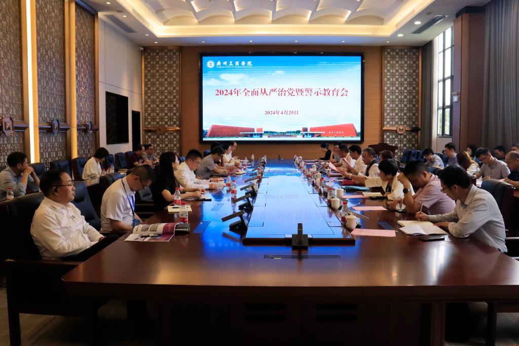 【本网讯】4月25日下午,学校在花都校区图书馆412会议室召开2024年全面从严治党工作暨警示教育会,深入学习贯彻二十届中央纪委三次全会、十三届省纪委三次全会精神和全省教育系统2024年全面从严治党工作视频会议精神,总结学校2023年全面从严治党情况,部署2024年工作。全体校领导,校党委委员、纪委委员,各职能部门、各教学单位负责人,各二级党组织负责人以及党纪学习教育联络员参加会议。