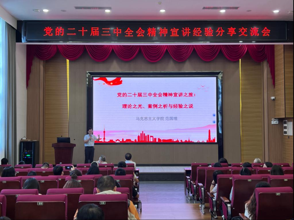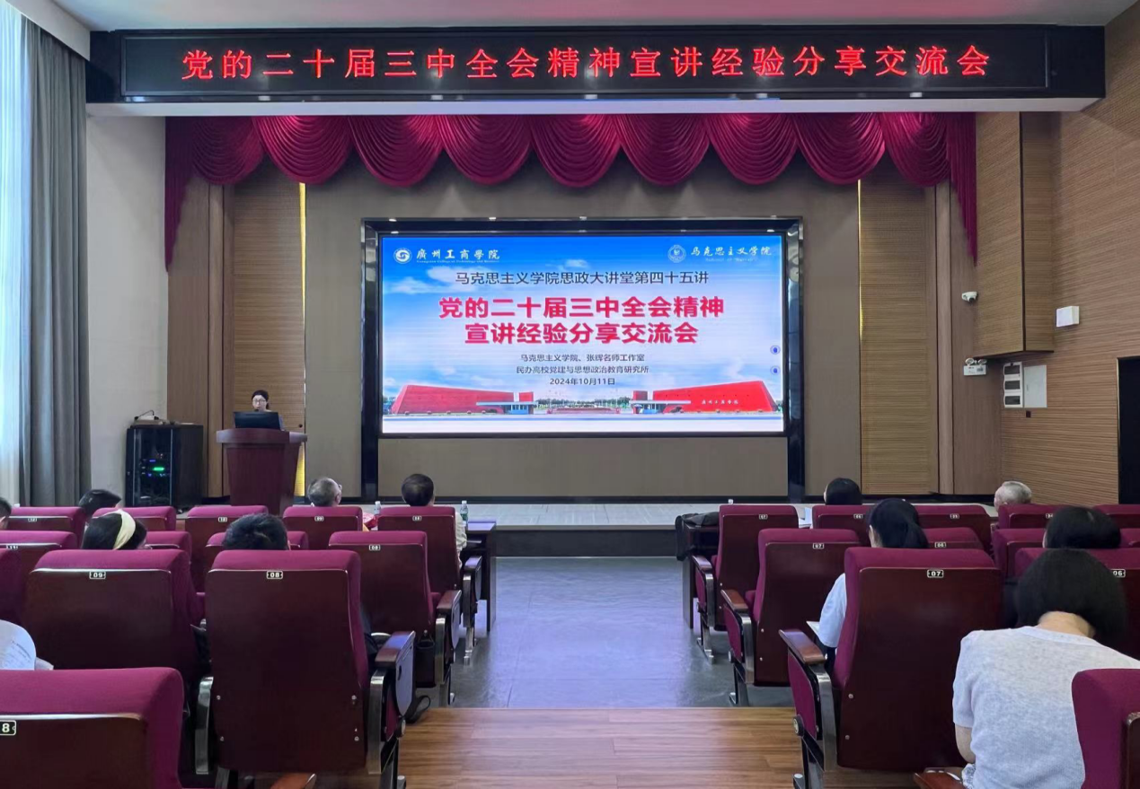 【本网讯】为全面深入学习贯彻党的二十届三中全会精神,提升全院教师理论宣讲水平,10月11日下午,学校马克思主义学院、张辉名师工作室、民办高校党建与思想政治教育研究所在花都校区联合举办了党的二十届三中全会精神宣讲经验分享交流会。此次会议汇聚了学院多位专家学者,旨在深化对全会精神的理解,交流宣讲经验,共同探讨如何更有效地将全会精神传达给广大师生及社会公众。