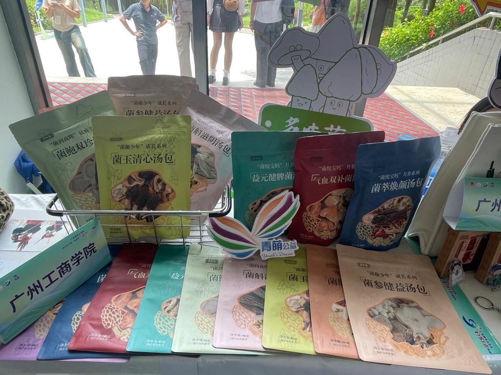 文化传承实践同样硕果累累。外语学院“乡约东源”青春实践队赴新港镇开展非遗蜡染、衍纸手工等文化课堂,设计畲族文化IP,推动少数民族文化传承与创新。情投“义”合突击队还立足义合镇下屯村省级“粤菜师傅”名村效应与林下经济资源,助力地方设计了沉浸式养生IP“多味菌”及其系列产品外包装袋,获广东青年大学生“百千万工程”突击队“文创+”竞赛“二等奖”。“追龙”突击队与香火龙传承人深入对话,为完善“追龙”古色宣传片以及“追龙”IP设计积累宝贵素材。“骆”力童心突击队挖掘骆湖镇“村BA”,挖掘篮球文化潜力,助力骆湖镇“篮球小镇”建设可持续发展。