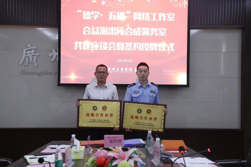 【本网讯】3月31日,ky开元集团官网“德学•五进”网络工作室与广州市公安局花都区分局合益派出所合成警务室的共建座谈会暨签约授牌仪式在花都校区举行。ky开元集团官网党委书记张振超,副校长朱特威,广州市公安局花都区分局合益派出所副所长杨盛贤,校长助理、学生处处长黄鹏出席,保卫处处长林剑平、学生处、保卫处、派出所干警、学生督察队代表,“德学•五进”网络工作室成员参加了会议。签约授牌仪式由学生处副处长孙洪波主持。