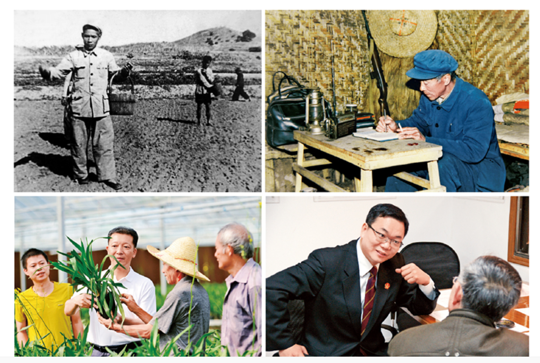 时代各有不同,担当一脉相承。一代又一代中国共产党人为了党和人民事业顽强拼搏、不懈奋斗,涌现出一批又一批先进典型。图片左上为县委书记的好榜样谷文昌,右上为改革先锋、最美奋斗者杨善洲,左下(左二)为时代楷模、全国优秀县委书记廖俊波,右下为时代楷模、全国模范法官邹碧华。
