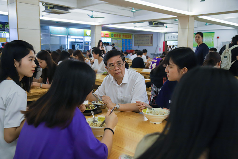 院长邝邦洪和副院长易露霞、后勤处处长李爱琼坐下后,对陪餐学生亲切询问。学生普遍反映饭菜合口味,对就餐环境也很满意,希望食堂对饭菜价格和菜量能做出适当调整。